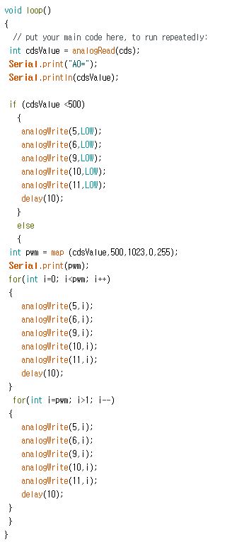 if 문을 써서 CdS센서 값이 500 이하면 아예 LED 불을 끄고,